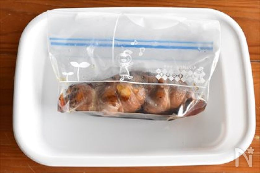 (3) 密閉袋に【A】を入れ、タコ糸を外した2を入れて漬け込む。できるだけ空気を抜いた状態で冷蔵庫で一晩漬けこみましょう。
