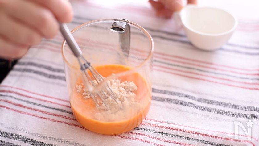 (下準備) ラムレーズンを作っておきます。レーズンをザルに入れ熱湯をかけて油分を取った後、キッチンペーパーで拭いて乾燥させてから、ひたひたになるくらいラム酒を注いで1週間浸けておく。