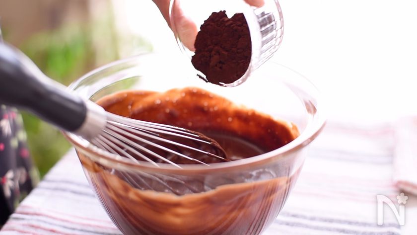 (3) 湯煎しておいたチョコレートバターをよく混ぜてから時ほぐした卵液を入れて泡立てないように混ぜる。
