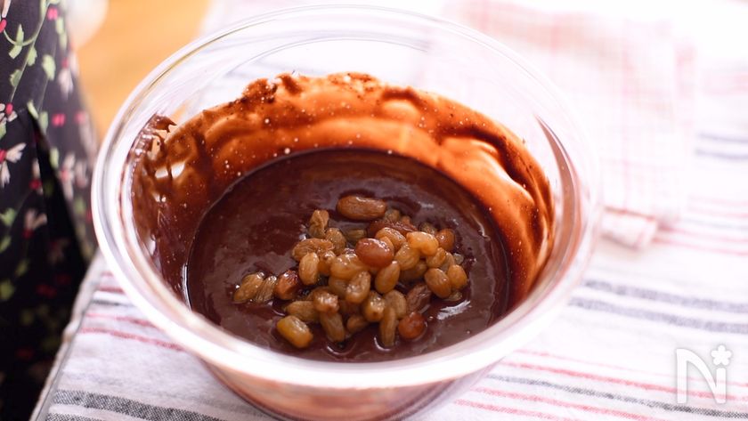(5) 作っておいたラムレーズンを入れて混ぜる。お好みで追加で大さじ1のラム酒を入れて混ぜる。