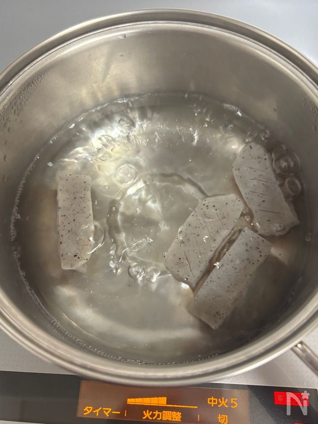 (2) 鍋またはフライパンに湯を沸かして、①のこんにゃくを加え、3分茹でる。
