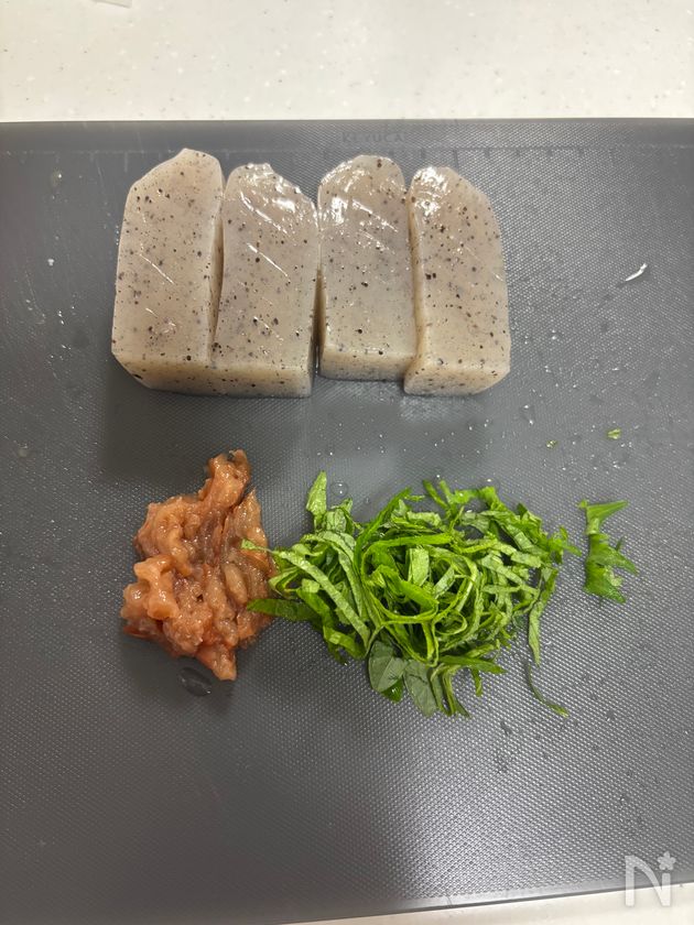 (4) こんにゃくを取り出し、冷めないうちに③のたれをかけ、大葉をのせる。