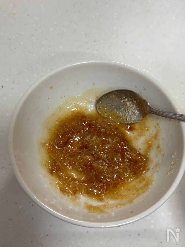 (3) その間に耐熱容器に【A】を合わせ、ラップをせず600Wのレンジで1分加熱する。いったん混ぜ、しゃばしゃばしていれば追加で30秒加熱する。