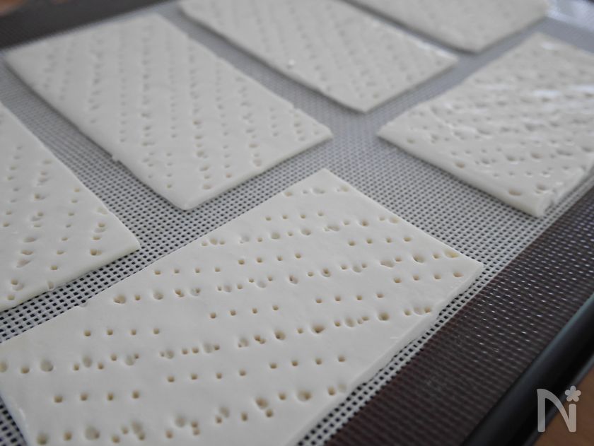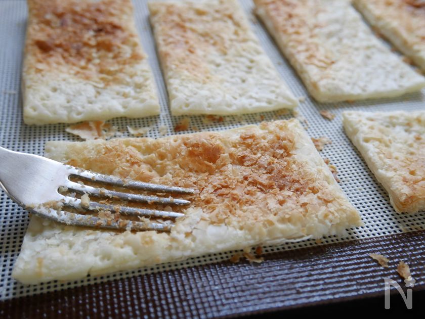(5) パイシートを3等分に切り、天板に並べ、フォークで穴を開ける。
