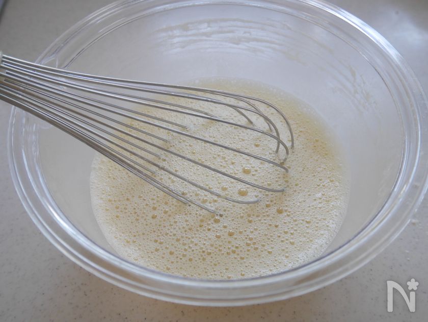 (2) 卵を割りほぐし、砂糖を混ぜ合わせたら、薄力粉を茶こしなどでふるい入れながらよく混ぜる。牛乳を少しずつ加え、よく混ぜる。