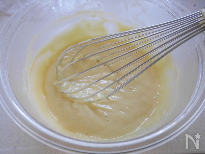 薄力粉は必ずふるいながら混ぜてください。一気に入れてしまうとダマになり、食感が悪くなります。