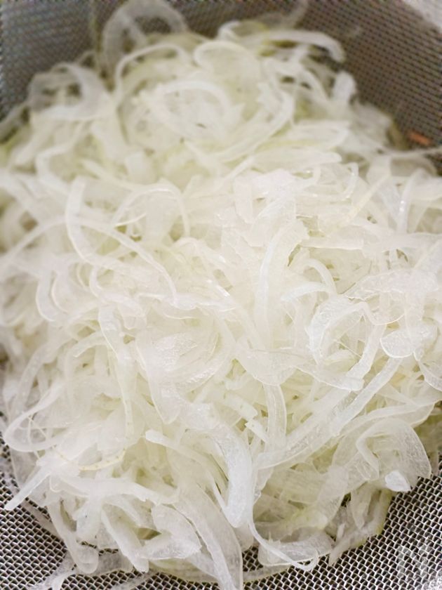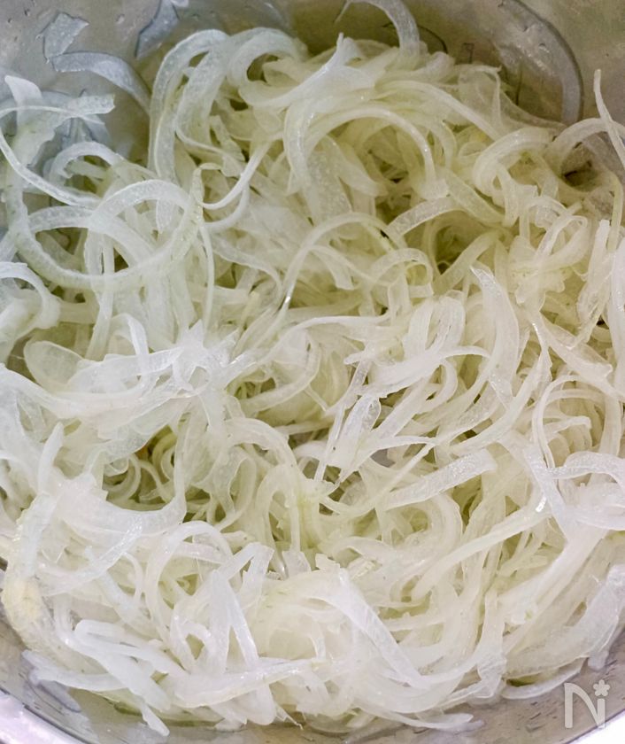 (1) 玉ねぎをスライサーで薄切りにし、塩ひとつまみ(小さじ1/8)ふり、全体を混ぜて10分置き水気をよく絞る。 ☆辛み成分が抜けて食べやすくなります。