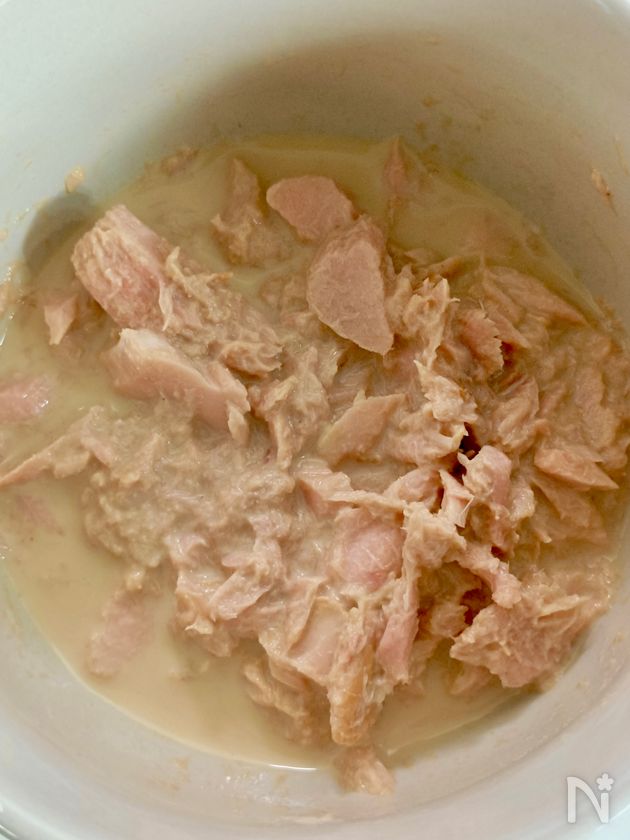 (4) ツナ水煮缶の汁気を切り、【B】と混ぜ合わせる。