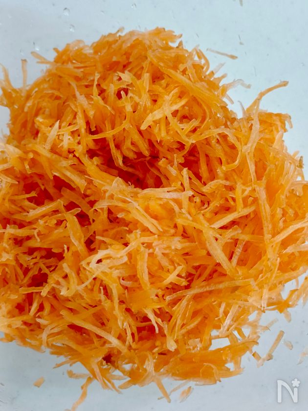 (3) にんじんを千切り器で細く切り、塩小さじ1をふって混ぜ合わせ、3分置く。水で洗い、よく絞る。