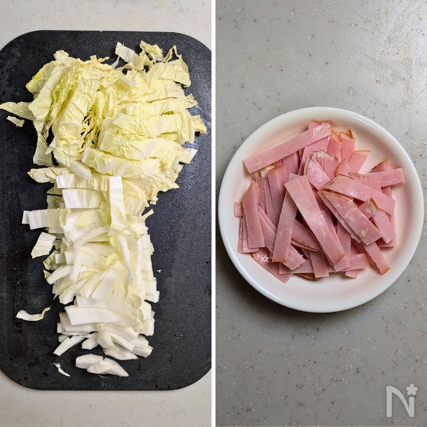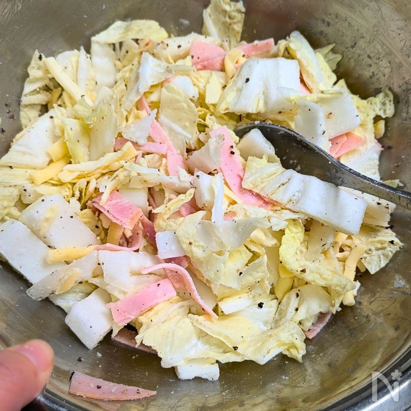 (2) ボウルに白菜とロースハムと【A】を入れて混ぜる。