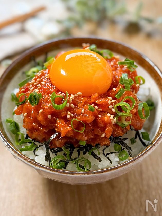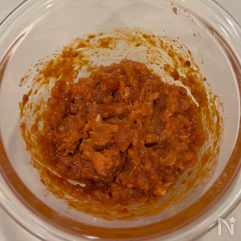 (2) 1にマグロのたたきを加えて混ぜ合わせる。
