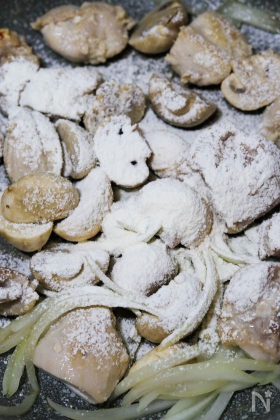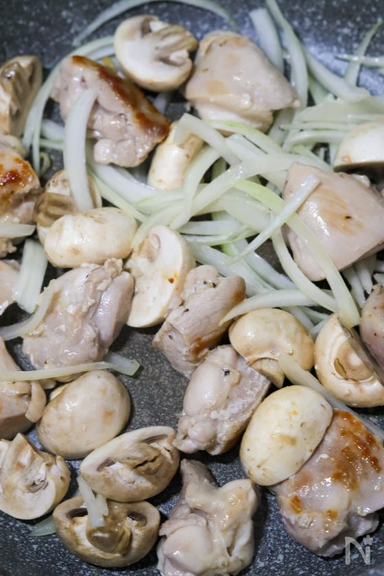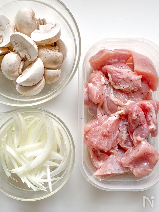 (1) 鶏もも肉はひと口大に切り、【A】をふる。玉ねぎは2~3mm幅の薄切りにする。マッシュルームは半分に切る。