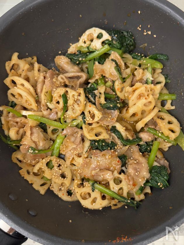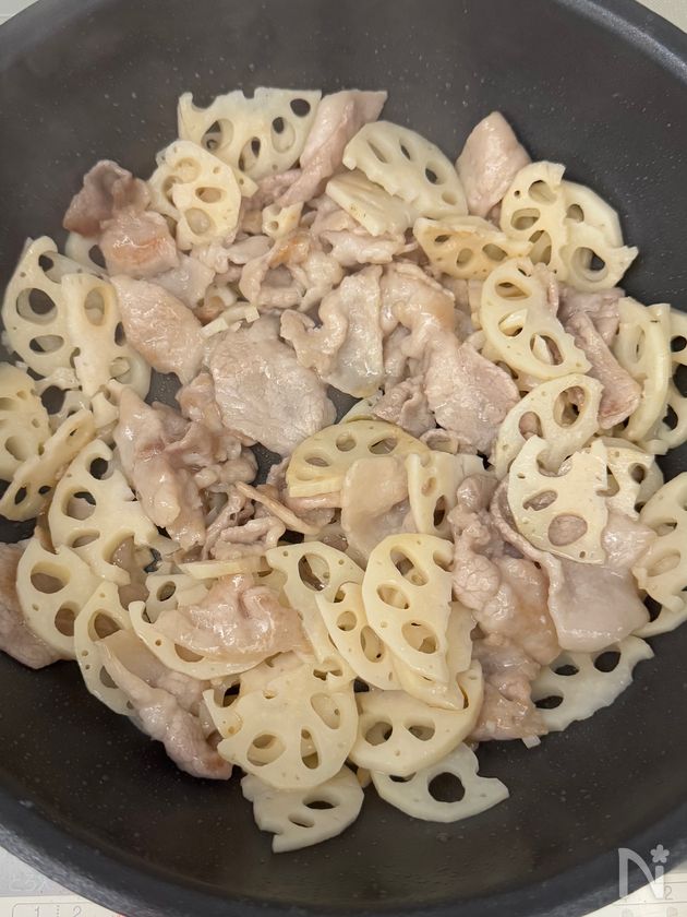 (2) 肉にまだ少し赤い部分が残っている位で、蓮根を入れ、3~4分炒める(肉と蓮根にしっかり火が通るまで)