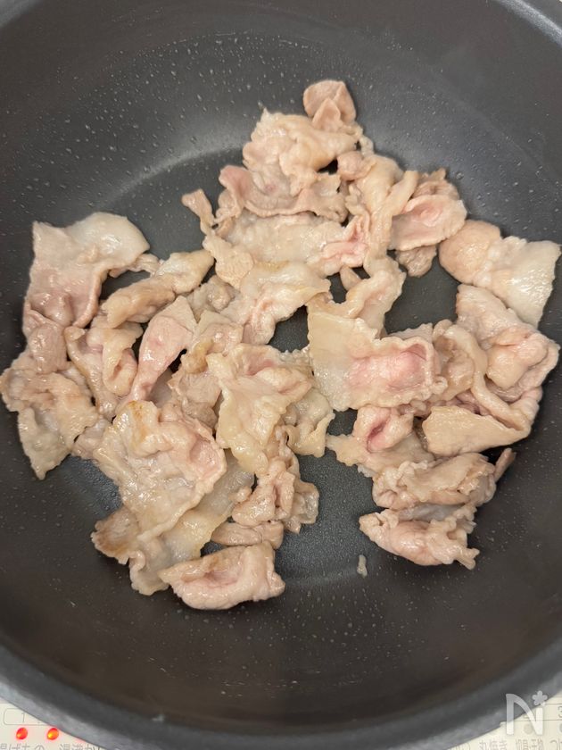 (1) フライパンに、ごま油を引き、片栗粉をまぶした豚バラ薄切り肉を、中火で炒める。