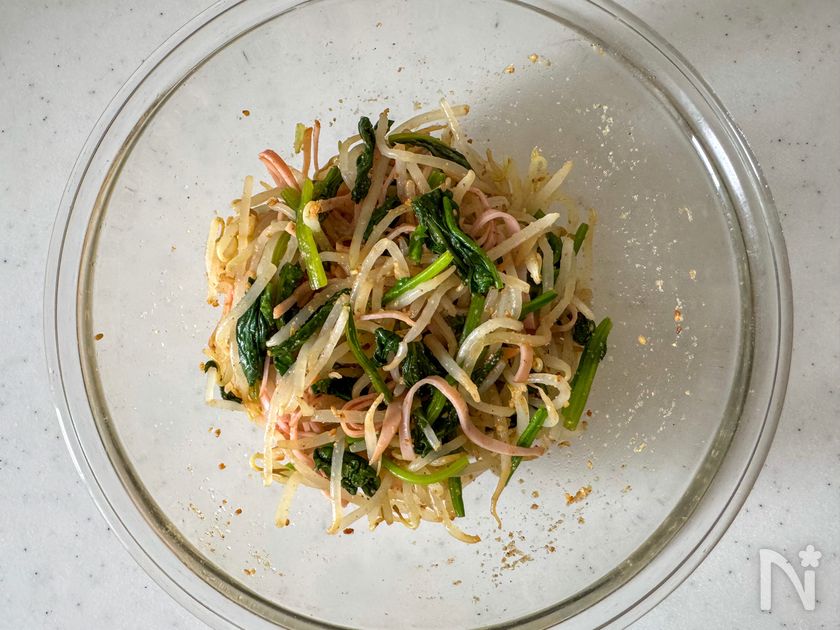 【もやしとほうれん草とハムのさっぱり中華サラダ】節約にも!