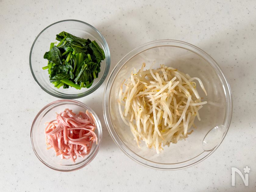 (1) もやしは耐熱容器に広げ、600Wの電子レンジで2分半加熱し、ザルにあけて水気を切り粗熱を取る。ほうれん草は沸騰した湯でさっと茹でて(レンジ加熱の場合はポイント参照)冷水にとる。水気を絞り、4cmに切る。ハムは細切りにする。