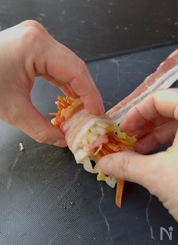 (3) 豚バラ薄切り肉を広げ、2の白菜とにんじんを置きくるっと巻く。