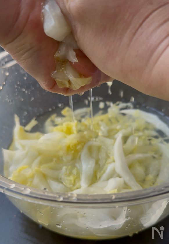 白菜はしっかりめに加熱してください。水けを絞るときは必ず粗熱をとってから絞ってください。