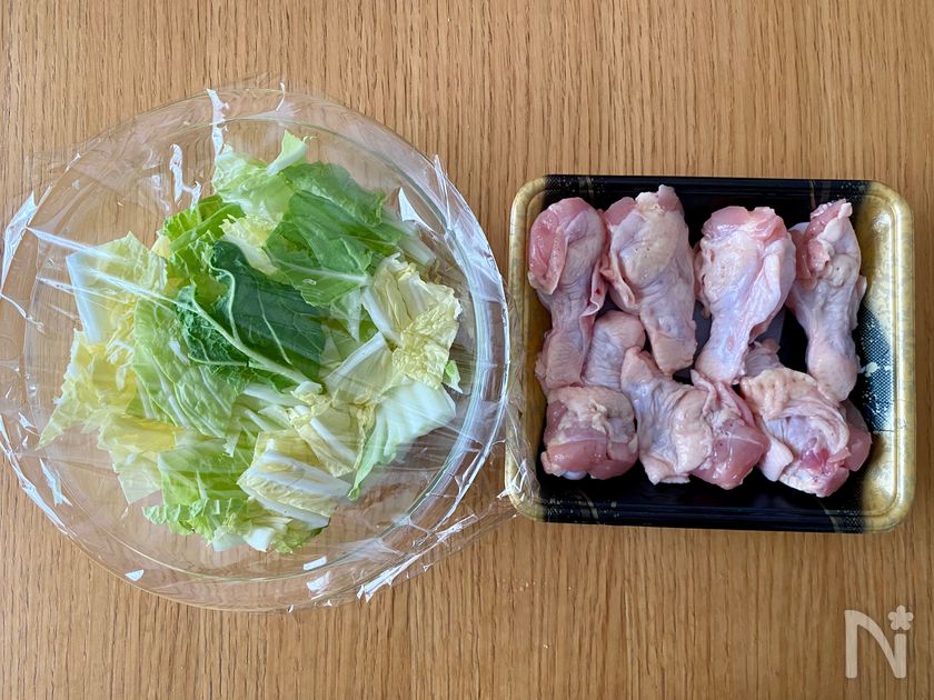 (下準備) 白菜は茎に部分を1㎝、葉の部分は3㎝幅に切り、洗ったら水気のついた状態で茎→葉の順に耐熱ボウルに入れ、ふんわりとラップする。
