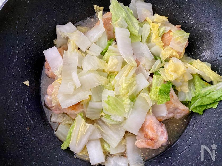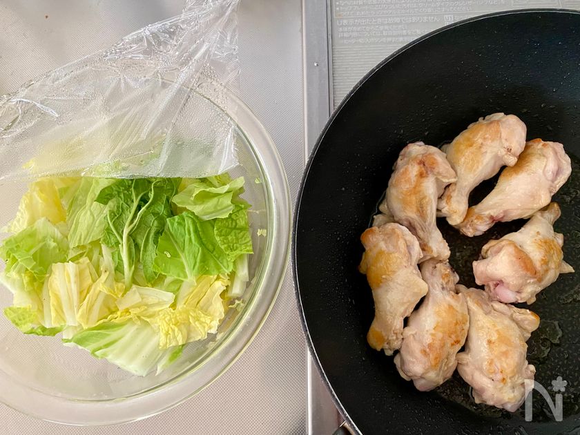 (2) フライパンに【A】を加えて混ぜたら、白菜を手羽元の上にのせてフライパンの蓋をし、中火で3分ほど火にかける。