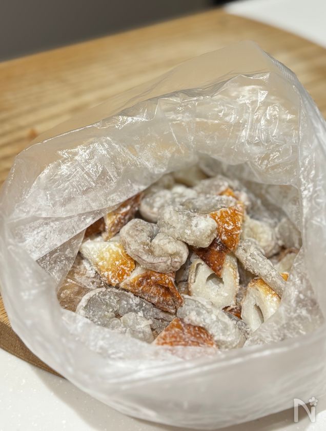 (1) ビニール袋にむきエビ、ちくわ、酒を入れてなじませたら、片栗粉を加えてよく振り、満遍なく衣をつける。