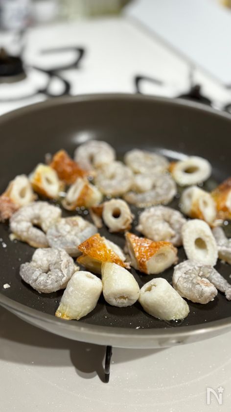 ちくわは焼き色がつきやすいので、焦げないように要注意!えびよりも早く火から下ろしてOKです。