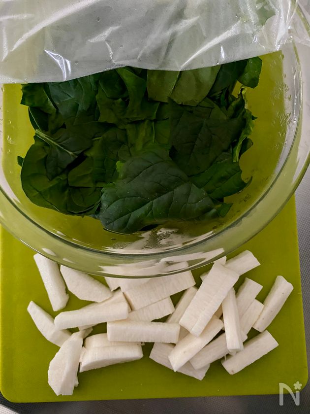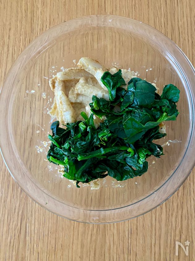 (2) ほうれん草をほぐしなが長芋の入っている耐熱ボウルに加えてよく混ぜる。