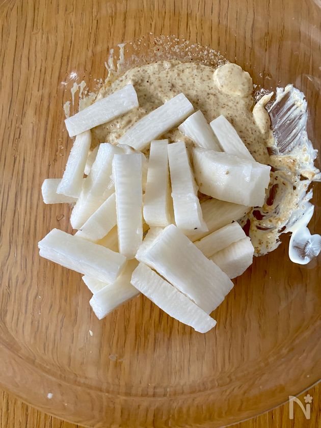 長芋はレンジ加熱時間を短くするとシャキシャキ食感が強くなり、加熱時間を長くするとホクホク食感になります♪