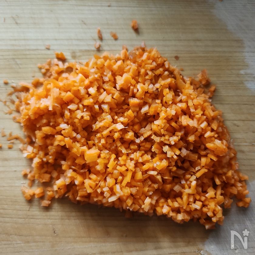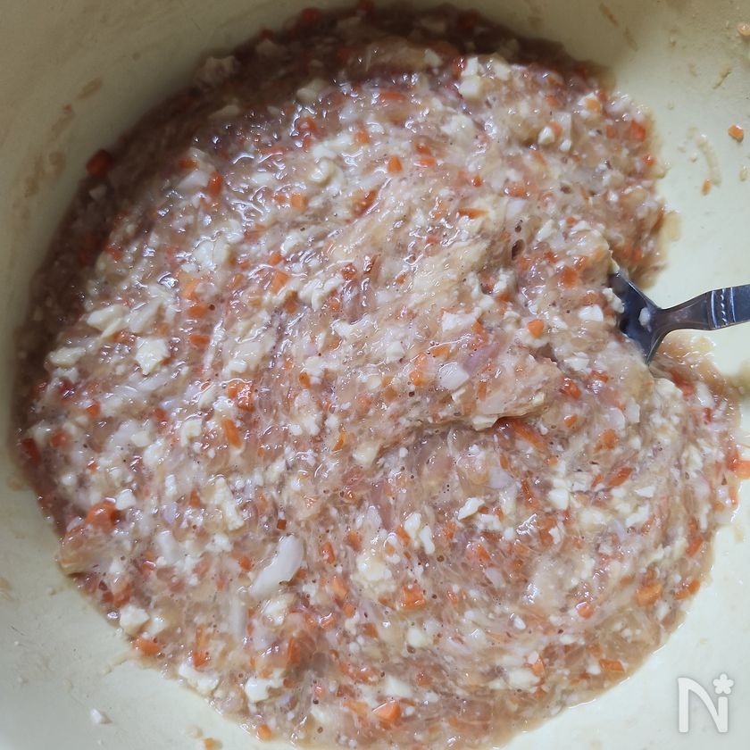 (2) 鶏ひき肉と【B】をよく混ぜ合わせる。