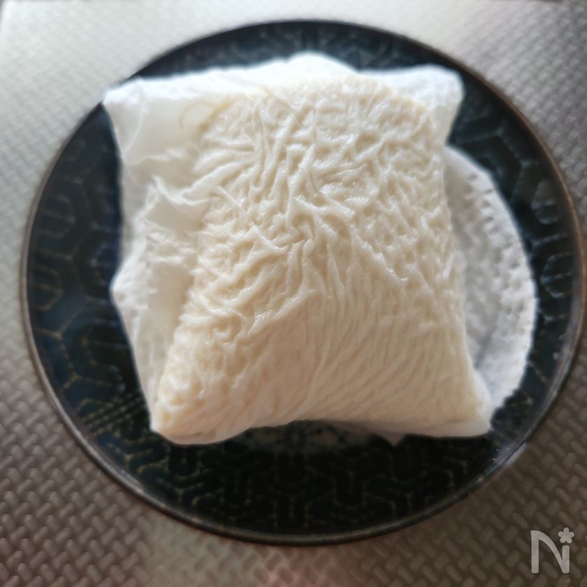 (下準備) きぬ豆腐はキッチンペーパーで包み、耐熱皿に乗せ600wの電子レンジで2~3分加熱し水切りする。