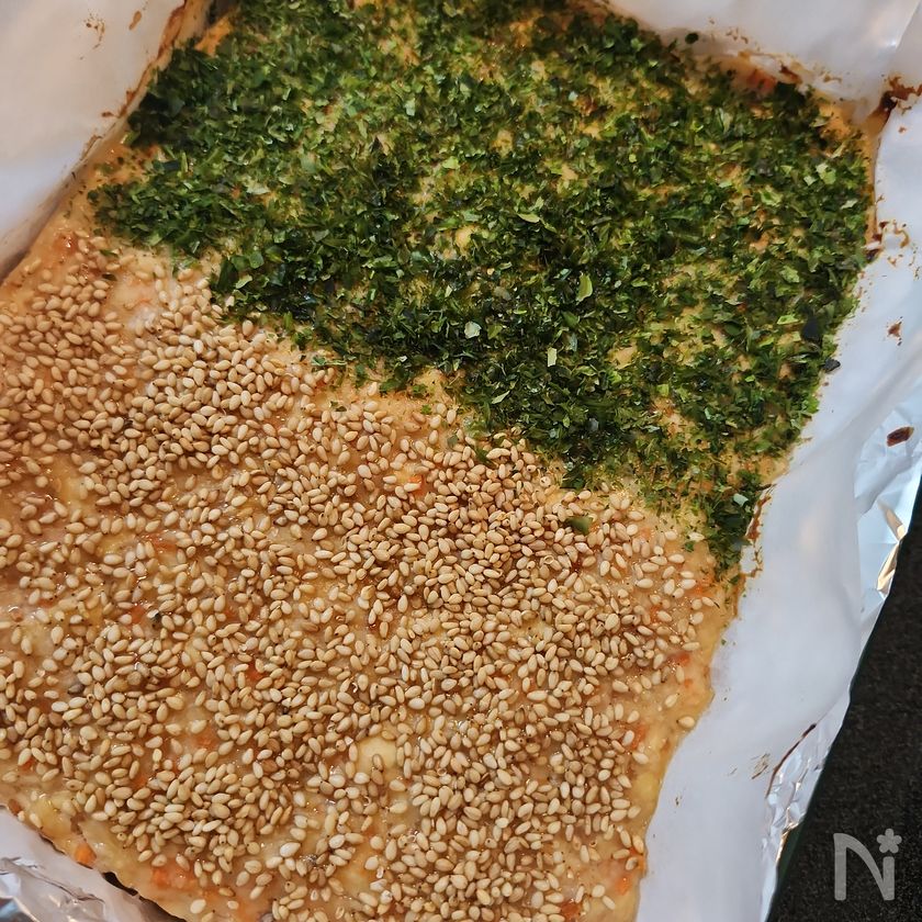 肉汁が出てきて中まで火が通ったら、熱いうちにもう半分に青のりをふる。