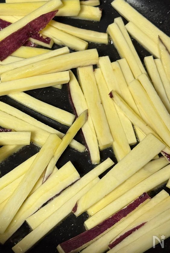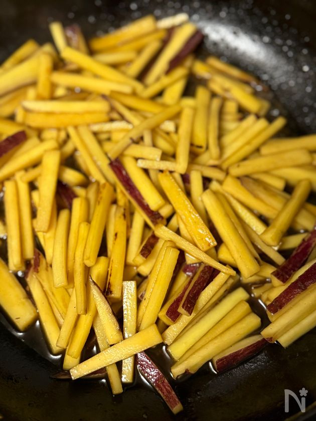 (1) フライパンに油を熱し、さつまいも全体に油がまわるように中火で2〜3分炒める。
