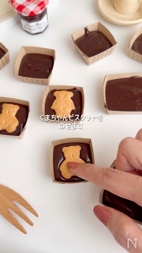 (3) 型に流し入れ、くまくまビスケットを上に乗せる。