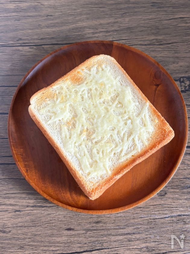 (1) 食パンにピザ用チーズをのせ、トースターでこんがり焼く。