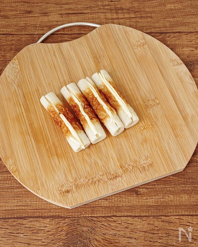 (2) スライスチーズを半分にして細くし、ちくわの切り込みに詰める。