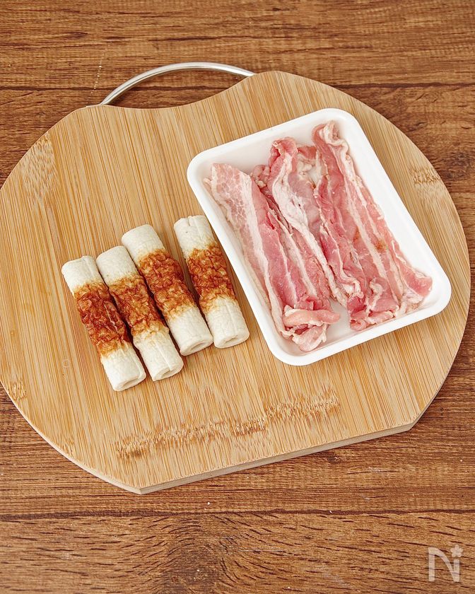 (3) ちくわに豚バラ薄切り肉を巻く。(巻いたあと、食べやすい大きさに切っても◎)