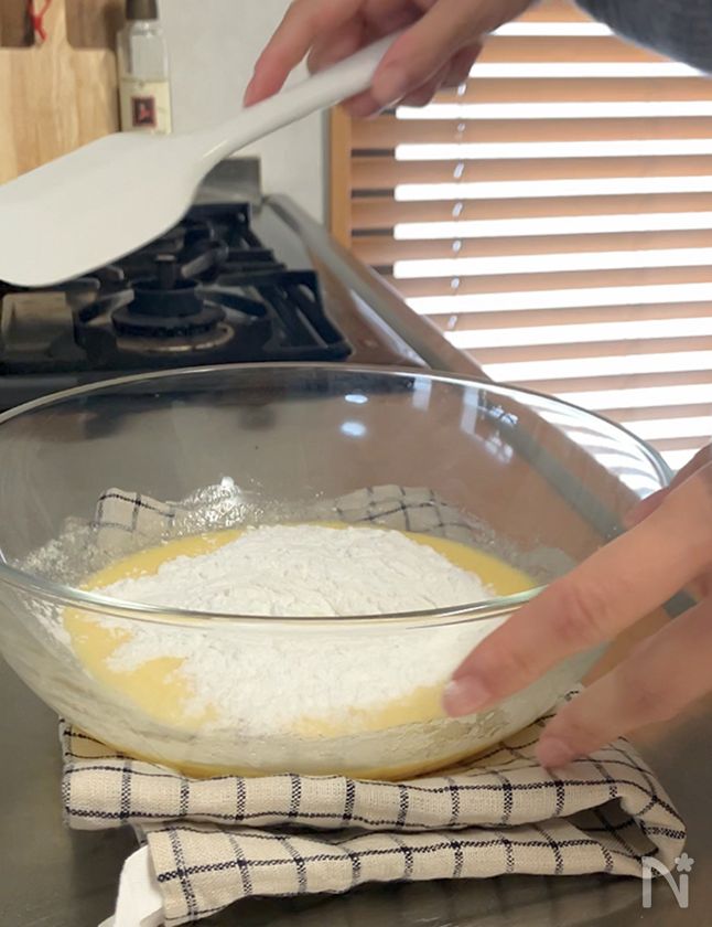 (2) 【B】を入れ、ゴムベラでさっくり混ぜ合わせる。