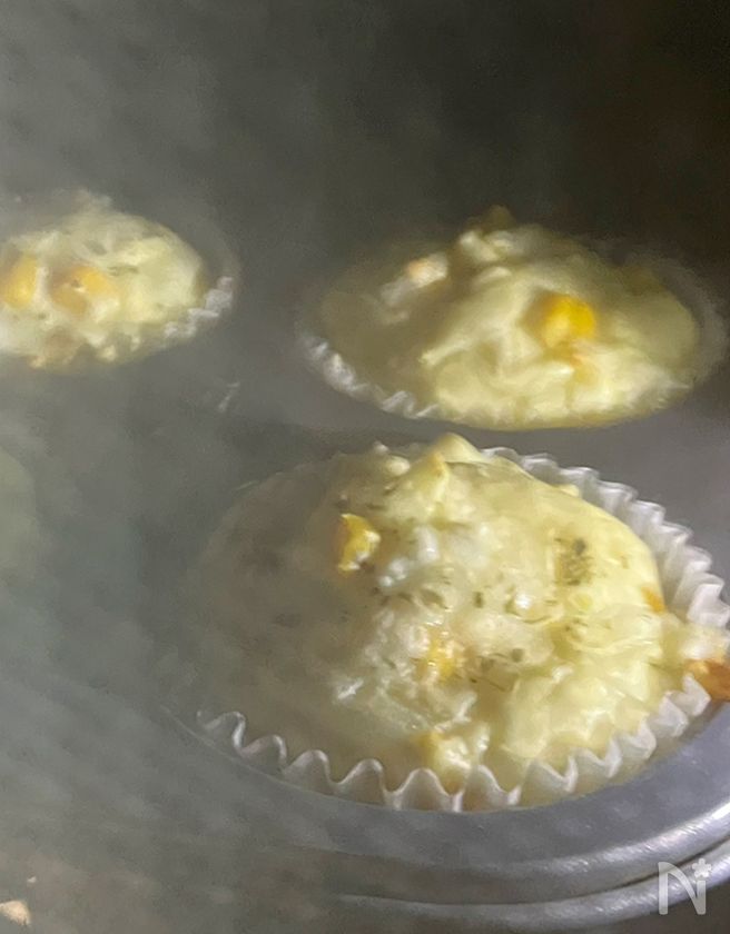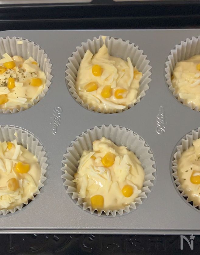 (4) マフィン型に、生地を8分目まで流し入れる。残しておいたコーンとチーズを上にトッピングし、お好みでパセリを散らす。