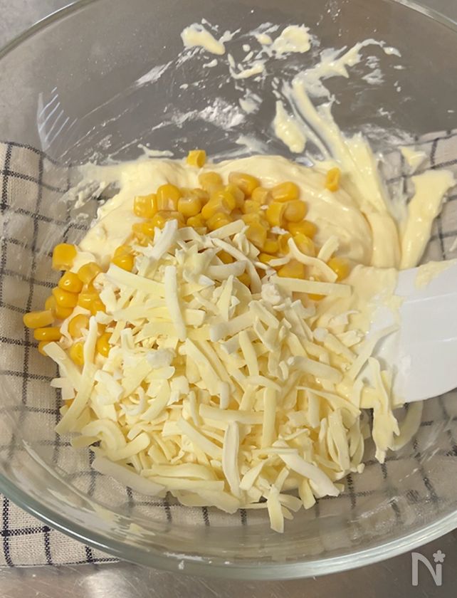 (3) コーンとピザ用チーズを加えて、軽く混ぜる。トッピング用に少し残しておく。