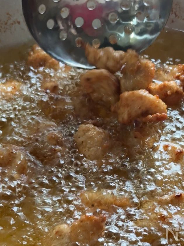 (5) 170~180℃のサラダ油で揚げる。きつね色でカリッとなったら揚げあがり。