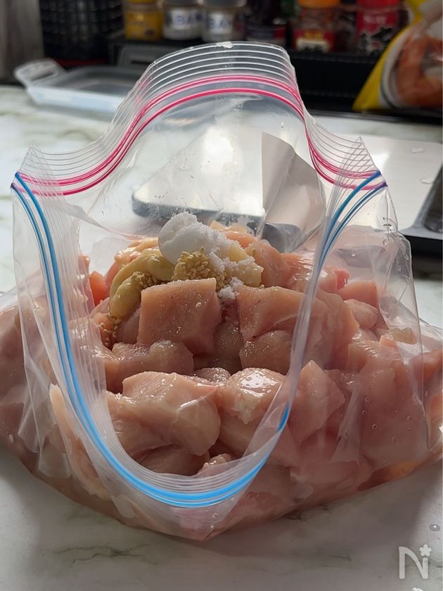 (1) 鶏むね肉を小さく切って(約2㎝角くらい)ビニル袋に入れる。