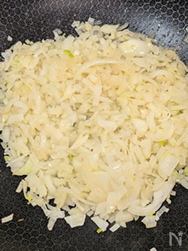鍋に玉ねぎ・塩をひとつまみ入れてヘラなどで混ぜながら2~3分炒める。(塩は分量外)