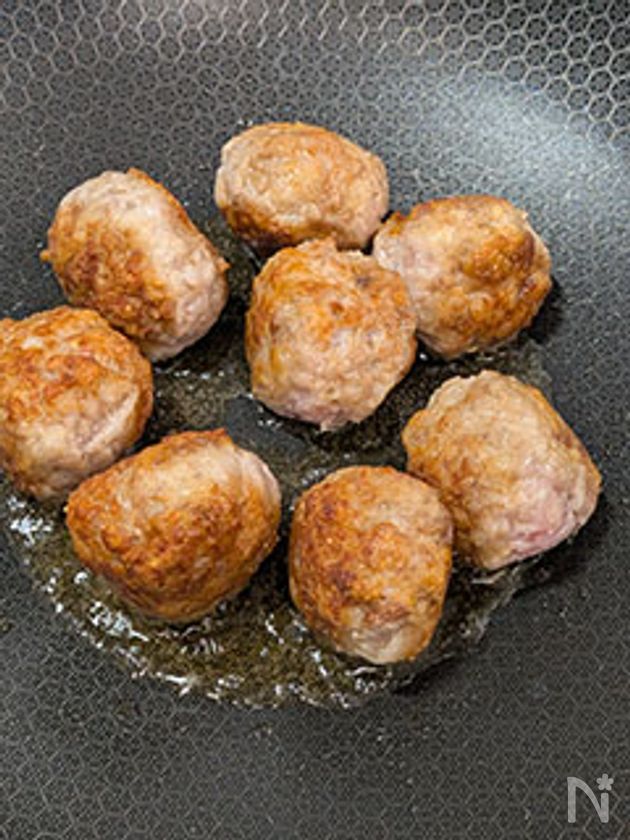 (6) 鍋にオリーブオイルを入れて中火で熱し、肉ダネを入れて全体に焼き目がつくまで焼く。