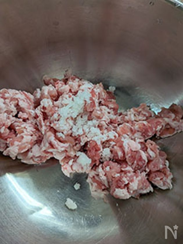 (5) 肉ダネの空気を抜きながら団子状に丸める。