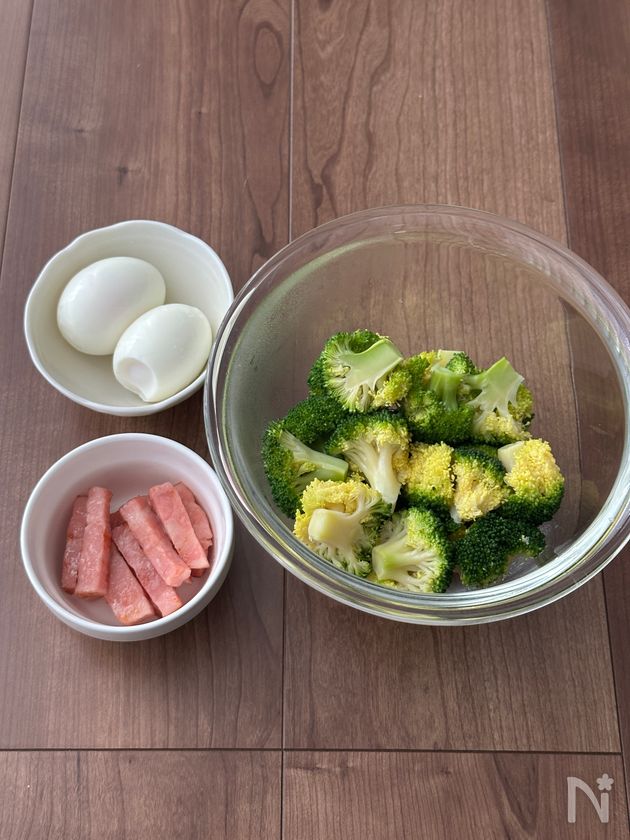 (1) ブロッコリーは塩茹で、ベーコンは焼き色がつくまで炒め、卵は7分半茹でて冷やしておく。