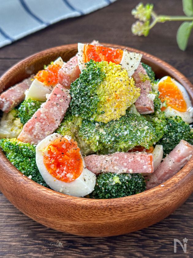 (2) ブロッコリーと厚切りベーコン、【A】をボウルに入れてしっかり和え、4等分に切った卵を入れてやさしく和える。