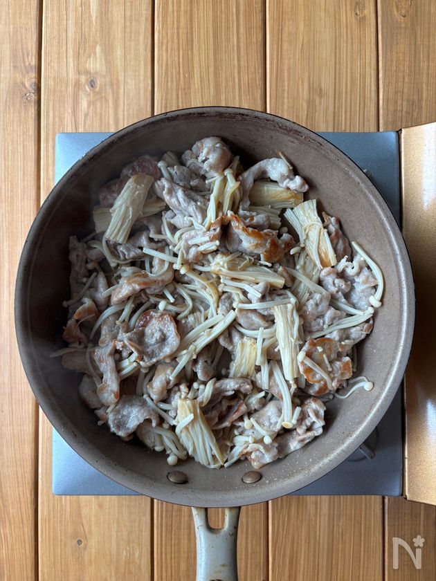 (4) 豚こま肉に火が通ったらえのきを加えて炒める。