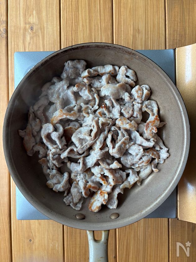 中火で熱したフライパンに胡麻油を引き豚こま肉を加えて炒める。