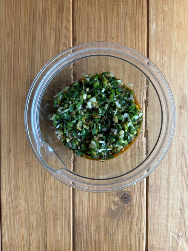 (2) 長ねぎ、にら、【B】を混ぜる。