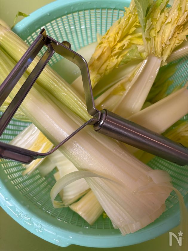 (1) セロリは葉の部分をちぎり、洗って根本10cmくらいをピーラーで剥く。